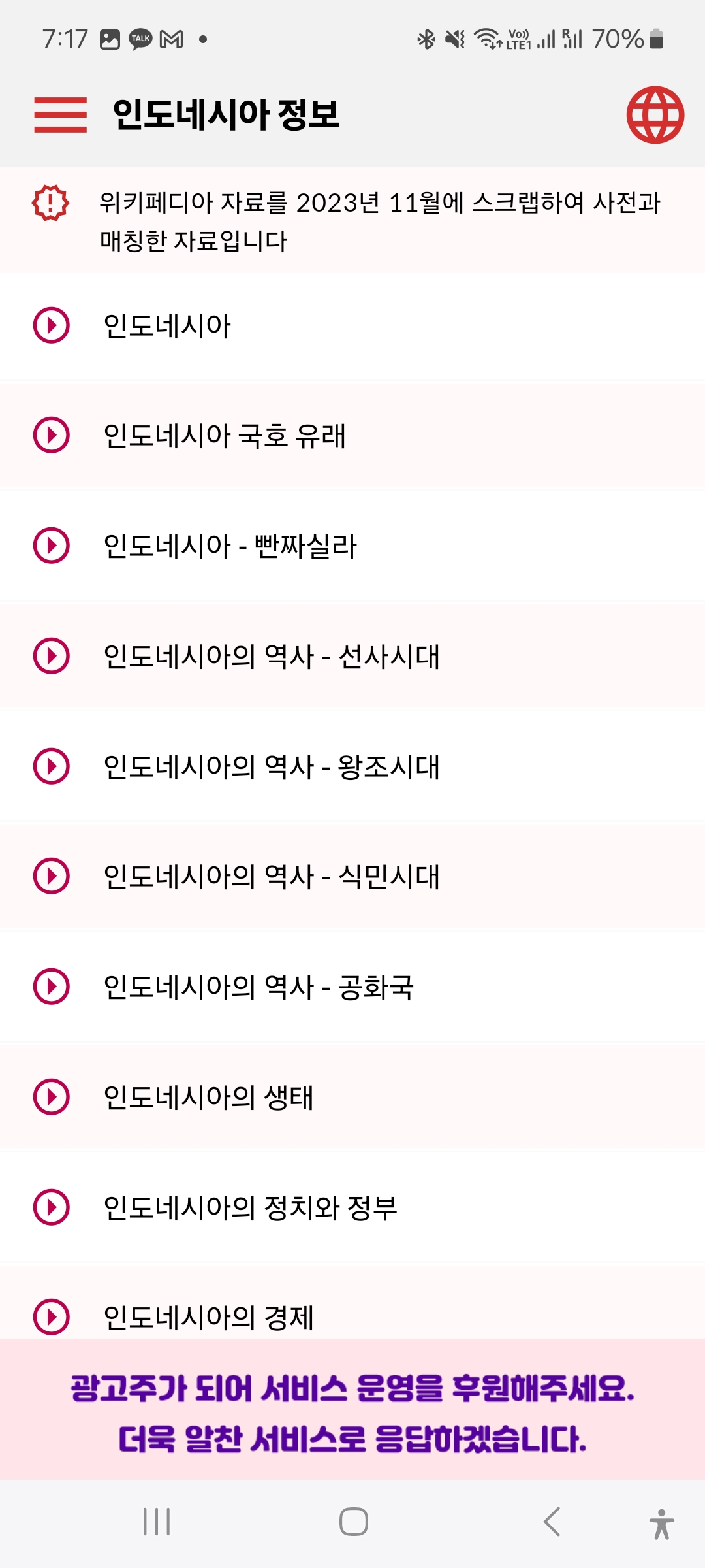 인포네시아에서는 하루에 하나씩 다양한 신문사의 헤드라인 기사중 랜덤하게 한개를 발췌하여 사전을 자동으로 매칭해서 서비스 하는 앱입니다.