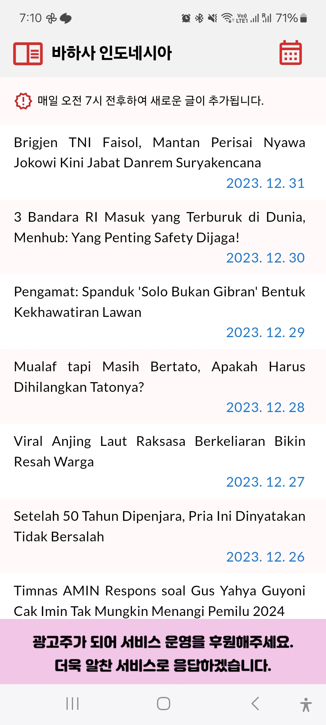 2) 바하사 인도네시아 (목록)![]() 화면 우측 상단의 달력 아이콘을 누르시면 2021년 7월부터 기사를 월별로 찾아보실 수 있어요. |